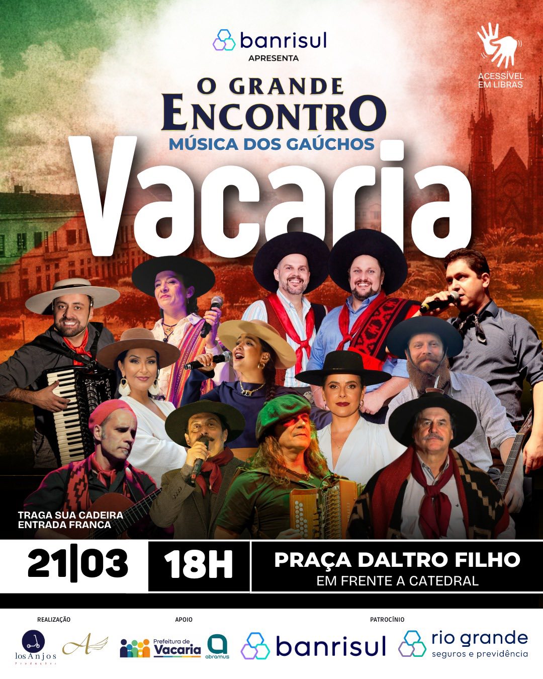 Vacaria recebe no dia 21 de março o projeto O Grande Encontro – Música dos Gaúchos, com apresentação de 12 artistas do cenário nativista. O show ocorre às 18h na Praça Daltro Filho, em frente à Catedral Nossa Senhora da Oliveira, com entrada franca.